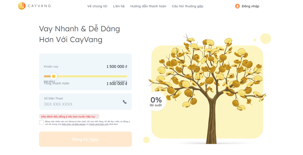 Cây Vàng nổi tiếng với dịch vụ vay online 24/7, chỉ cần điện thoại kết nối Internet là có thể đăng ký.